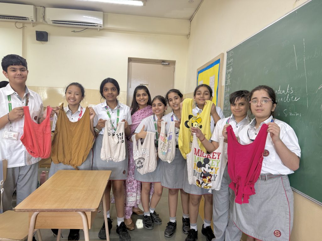 In our recent SUPW session, students put their creativity and eco-consciousness into action. ♻️ They upcycled old T-shirts into stylish no-stitch tote bags, proving that fashion can be planet-friendly. 🎨 They also got hands-on with tie-dye techniques on plain white handkerchiefs — folding, twisting, and dyeing to create vibrant, one-of-a-kind patterns.